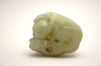 Scultura in nefrite di colore verde chiaro raffigurante un bufalo adulto con il piccolo.