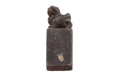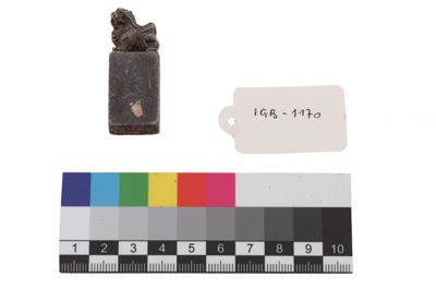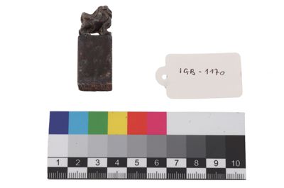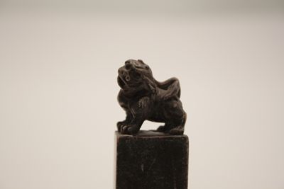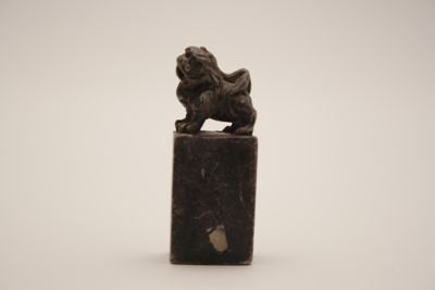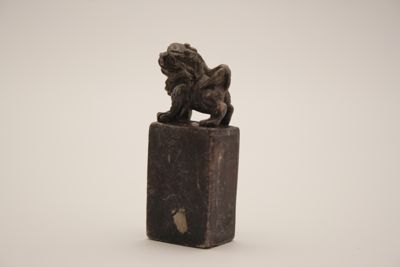 Pietra per sigillo a forma di parallelepipedo sormontato da un leoncino a tuttotondo.