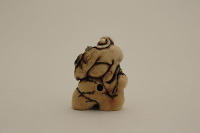 Netsuke, fermaglio per cintura, in avorio scolpito a tuttotondo e patinato, raffigurante un uomo con la lunga barba, in abiti cinesi finemente decorati a motivo floreale, appoggiato a una roccia.