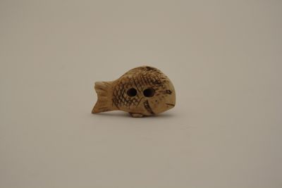 Netsuke, fermaglio per cintura, in osso scolpito a tuttotondo e patinato raffigurante Ebisu sopra la carpa. Sotto il pesce si trovano i due fori obliqui (himotoshi) da cui si faceva passare un cordoncino in seta.