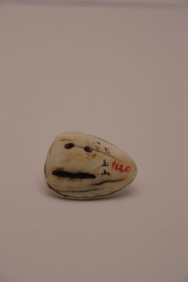 Netsuke katabori, o a tutto tondo, in avorio dipinto raffigurante una conchiglia. Il retro presenta macchie giallastre in alcuni punti. Sono presenti due fori obliqui, himotoshi, da cui si faceva passare un cordoncino in seta.