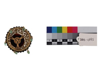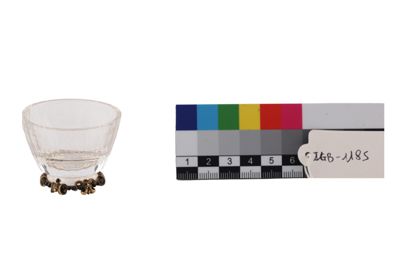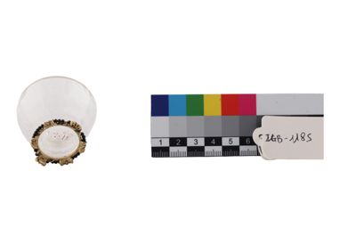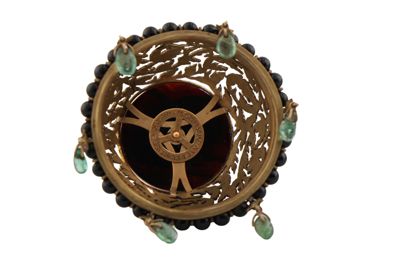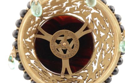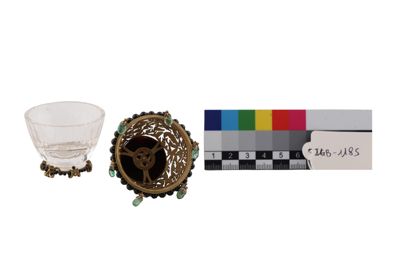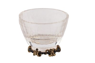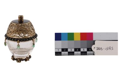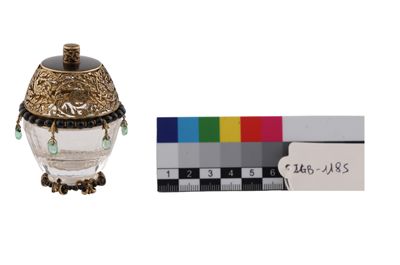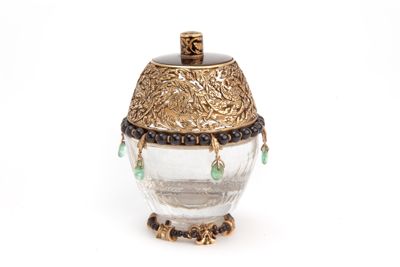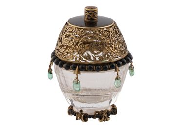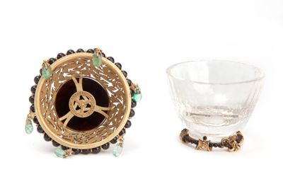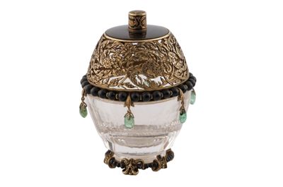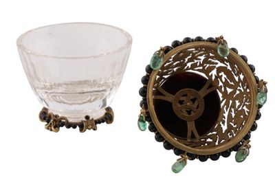 Coppetta portaprofumo in cristallo di rocca su base in oro, con filo di perline in onice e coperchio in oro traforato, con piatto in onice e sei smeraldini a pendente.
