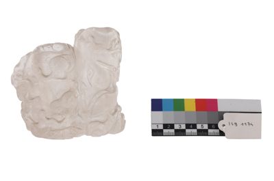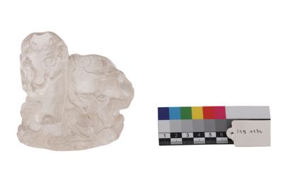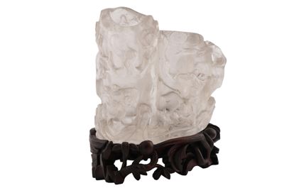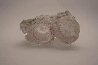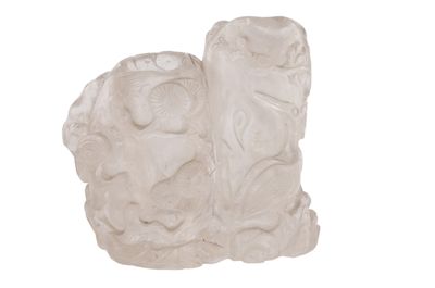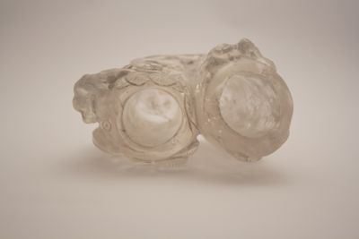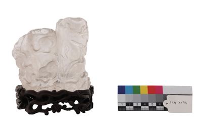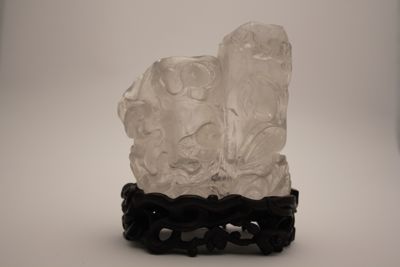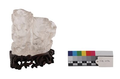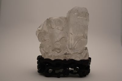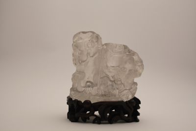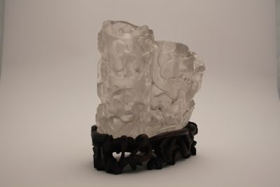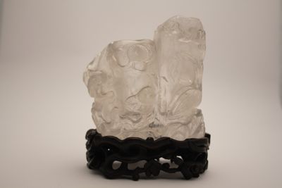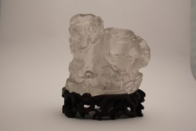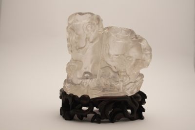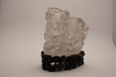 Scultura in cristallo di rocca, riproducente due montagne unite a formare due vasi. L'oggetto è decorato a basso rilievo con un cervo e una gru nei pressi di un pino e un fungo (lingzhi). La base in legno intagliato è inventariata con numero IGB-1175