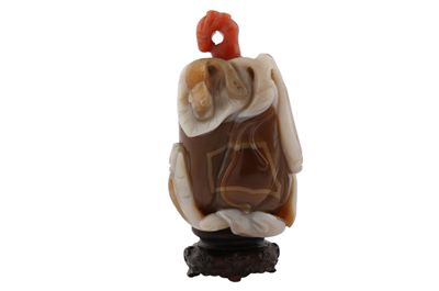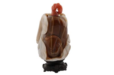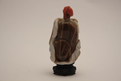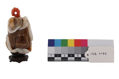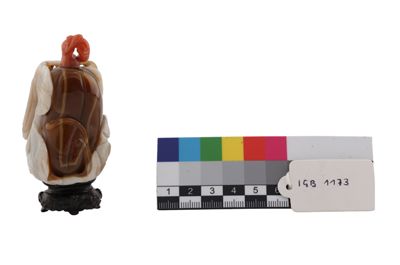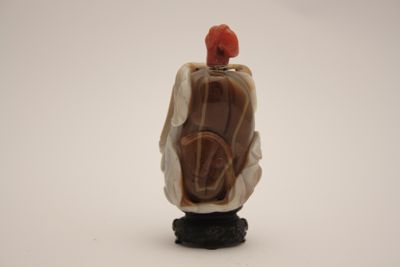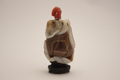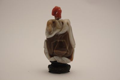 Boccetta da fiuto in pietra dura con tappo in corallo rosso al quale è attaccato un cucchiaino in avorio. Nell'intaglio sono raffigurati un fungo e un pipistrello. Basetta in legno sagomata e decorata a traforo a motivo di nuvole.