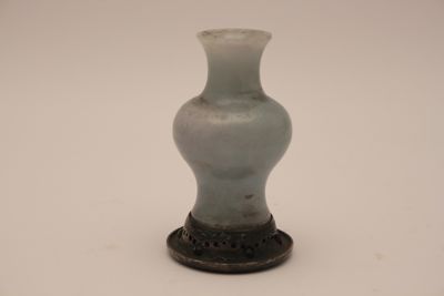 Piccolo vasetto a balaustra in giada con pancia molto espansa e bocca e piede strombati. Il piede si incastra su una base metallica traforata e intarsiata.