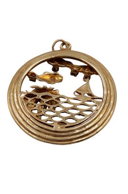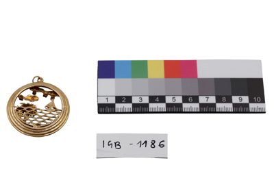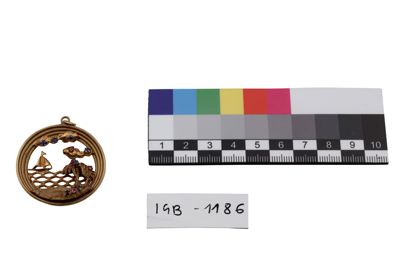 Ori: medaglione traforato con pietre dure raffigurante paesaggio marino (d. cm. 3,8)