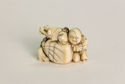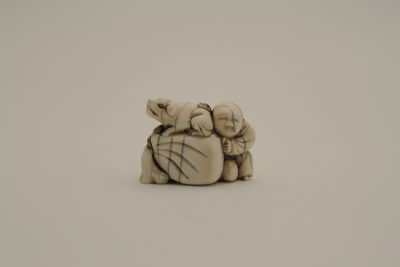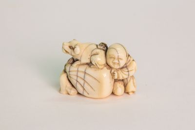 Piccola scultura in avorio scolpita a tuttotondo e patinata raffigurante un bambino sorridente vicino a un sacco sopra il quale si trova un cagnolino. Un grosso foro non passante sul fondo.