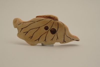 Netsuke, fermaglio per cintura, in avorio scolpito a tuttotondo e patinato raffigurante una foglia di loto piegata dalla quale esce un granchio. Alcuni dettagli, come le venature della foglia, sono incisi in nero. L'avorio presenta macchie giallastre in alcuni punti. Due fori passanti (himotoshi) si trovano su un lato.