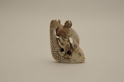 Netsuke, fermaglio per cintura, in osso scolpito a tuttotondo e patinato, raffigurante il sennin Kinko, tipicamente rappresentato come un uomo con lunga barba che cavalca una carpa più grande di lui. Alcuni dettagli, come i capelli e le decorazioni del kimono, sono incisi in nero. Sulla base sono presenti tre fori, creati probabilmente in Europa per saldare l'oggetto ad un piedistallo, mentre i due fori obliqui (himotoshi) per il cordoncino, sono stati praticati su un fianco della carpa. Alla base si trovano quattro segni incisi in rosso.