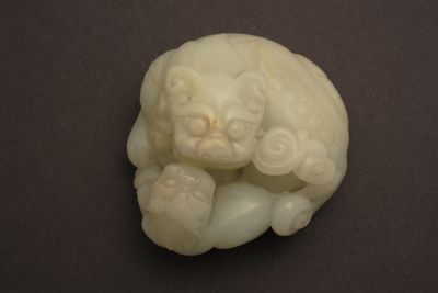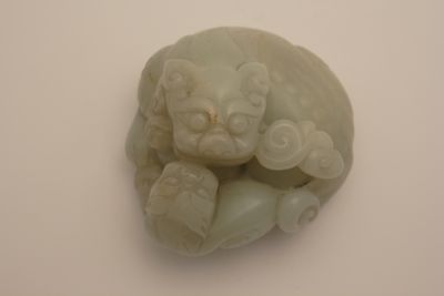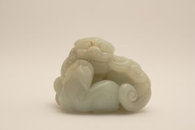 Piccola scultura decorativa in nefrite raffigurante una coppia di leoncini, un adulto e un cucciolo, affrontati.