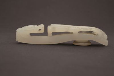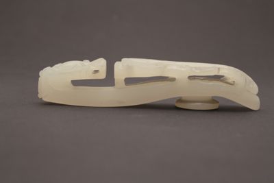 Riproduzione in giada bianca di antica fibbia per cintura . La forma è pressoché quella di una fettuccia sinuosa con le estremità ripiegate a formare due draghi affrontati. Sotto si trova il fermo a forma di cilindro ovale con estremità sporgente a disco.