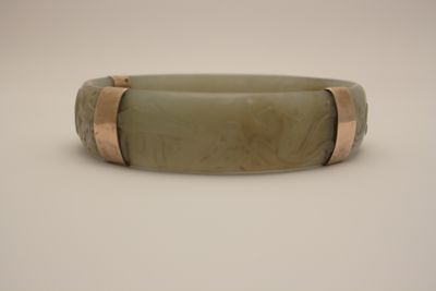 Braccialetto in giada di forma circolare appiattita, decorato a bassorilievo su tutta la superficie con motivi geometrici e fitomorfi. L'oggetto è impreziosito da quattro fascette d'oro.