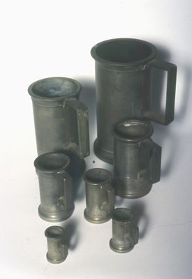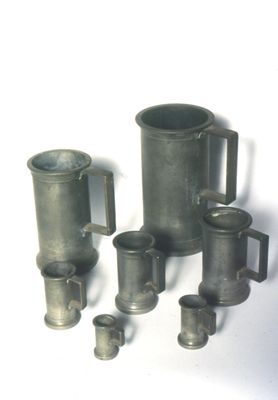 Il compendio è formato da sette recipienti in peltro a corpo cilindrico terminanti ciascuno con il piede e il bordo a forma semplice, di diametro quasi uguale tra loro e molto marcati rispetto al corpo. Su ciascun bordo sono visibili le punzonature di controllo della misura. Per ogni recipiente, lateralmente, è presente un manico, dello stesso materiale del corpo, a forma rettangolare.
