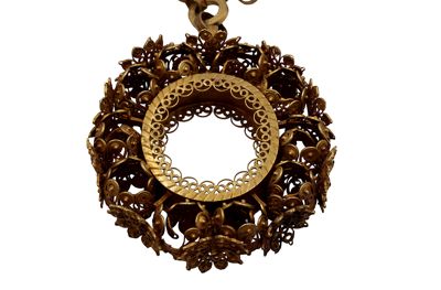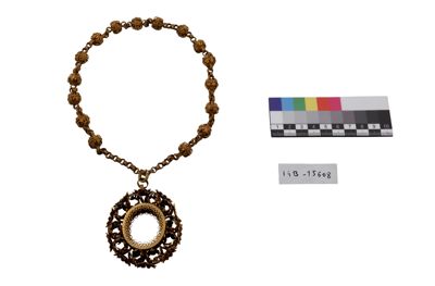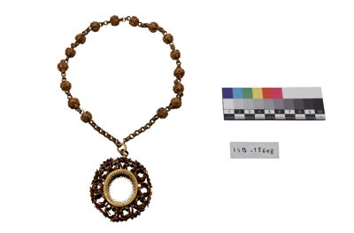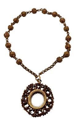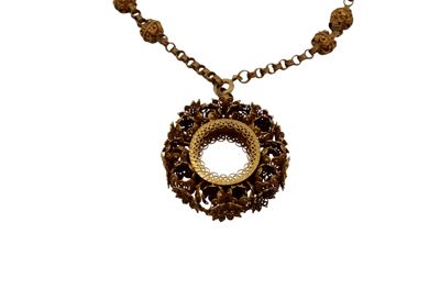 Collana con pendente circolare in oro lavorato con tecniche della filigrana e granulazione con motivi floreali e sfere granutate sulla catena.