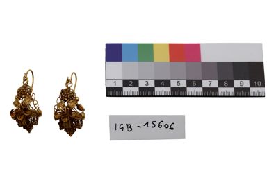 Coppia di orecchini in oro lavorato con la tecnica della granulazione, a motivo floreale.