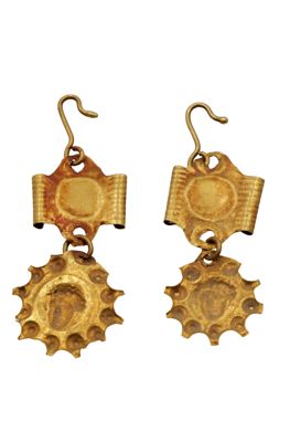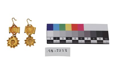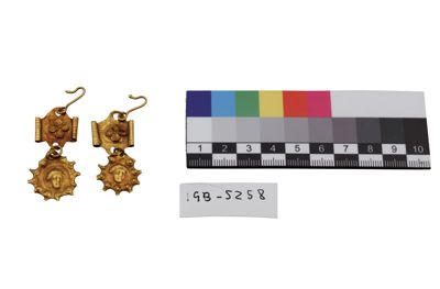 Il manufatto si presenta come un paio di orecchini in oro ad imitazione stile etrusco-romano e iconografie antiche: qui sono raffigurate due teste femminili entro un cerchio i cui lati sono decorati con sfere. Nella parte superiore è invece un cartiglio con decorazione floreale su ciascun orecchino.