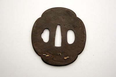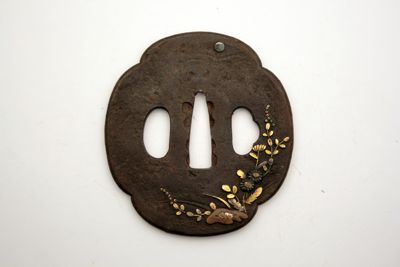 Elsa di spada giapponese di forma quadrilobata (mokko), con bordo leggermente rialzato rispetto alla superficie, con i tre fori canonici, quello centrale (nakagoana) per il codolo, il foro di sinistra (kozuka hitsuana) per il coltellino, e quello di destra (kogai hitsuana) per lo spillone. La decorazione, a motivo di fiori, è realizzata con intarsi in oro, ottone, argento e shakudo.