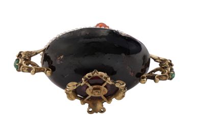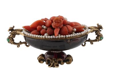 Coppetta in granato con fiori e frutta in corallo e manici d'oro a forma di arpie