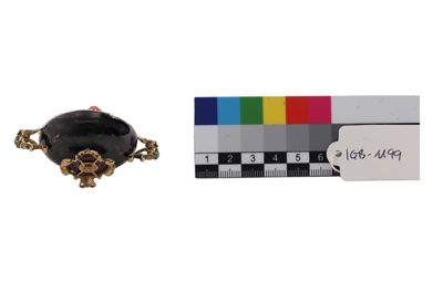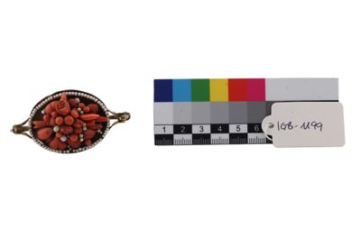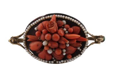 corallo; oro (fusione); perla (incastonatura); perla (incastonatura); granato (intaglio)