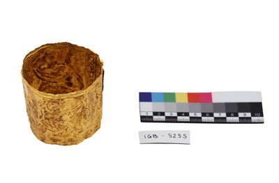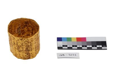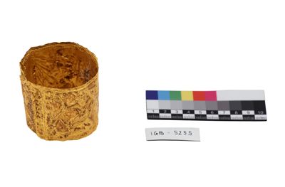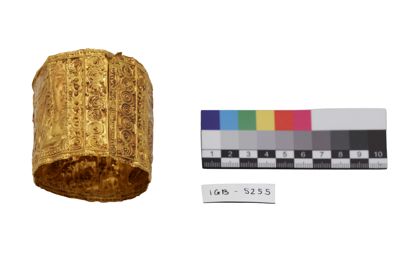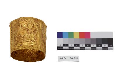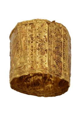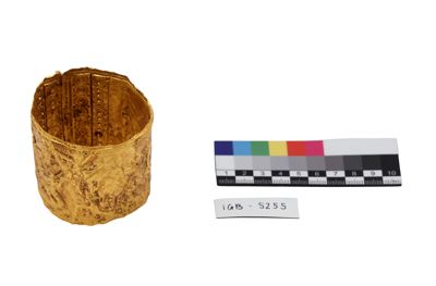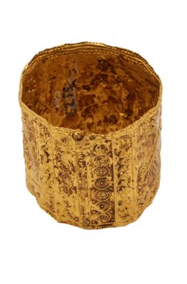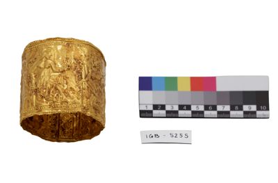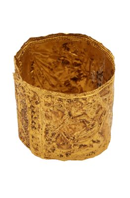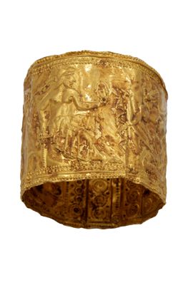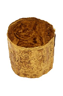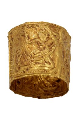 Il manufatto si presenta come una bracciale in oro ad imitazione stile etrusco-romano e iconografie antiche: qui sono tre figure, di cui quella al centro seduta in trono. La chiusura del braciale è poi decorata con motivi concentrici e a sfera in rilievo.