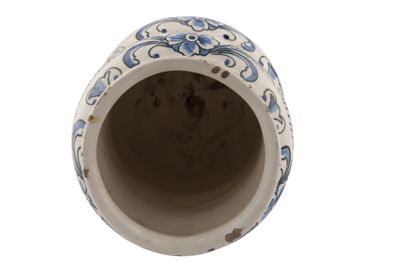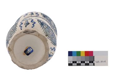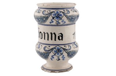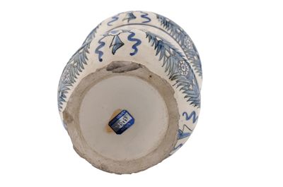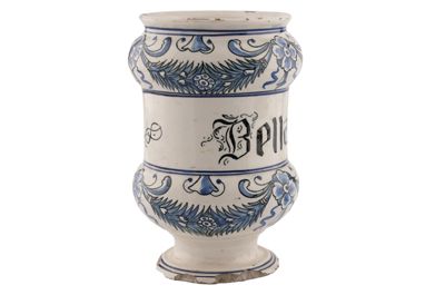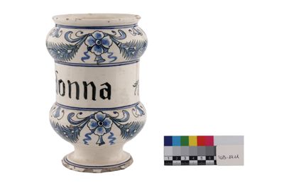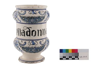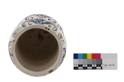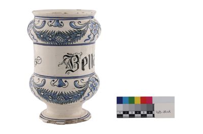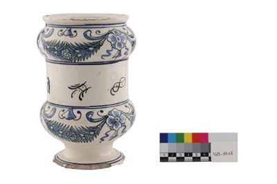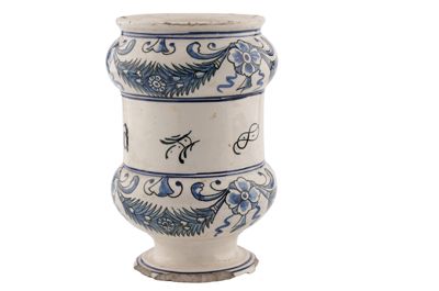 Vaso da farmacia a rocchetto, forma comunemente denominata albarello. Imboccatura con orlo leggermente estroflesso collo appena accennato. Corpo cilindrico con spalla arrotondata e larga fascia centrale. Piede piatto e svasato leggermente più alto del consueto.