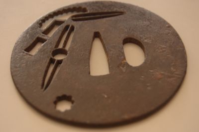 Elsa di spada giapponese di forma rotonda. Sono presenti il foro centrale per il codolo (nakagoana) e il foro di sinistra (kozuka hitsuana). La superficie si presenta martellata, mentre la decorazione, ricavata a traforo, in negativo, mostra la sagoma di un ramo di bambù.