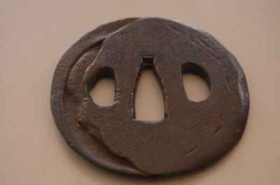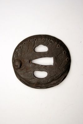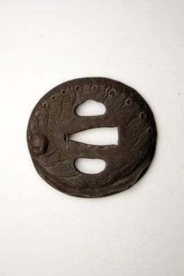 Elsa di spada giapponese di forma ovale, con i tre fori canonici, quello centrale (nakagoana) per il codolo, il foro di sinistra (kozuka hitsuana) per il coltellino, e quello di destra (kogai hitsuana) per lo spillone. Rappresenta una orecchia di mare (awabi).