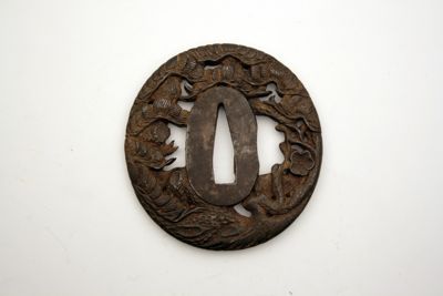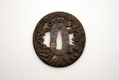 Elsa di spada giapponese di forma ovale. Il foro di sinistra (kozuka hitsuana) per il coltellino, e quello di destra (kogai hitsuana) per lo spillone si presentano di forma irregolare, e seguono il motivo inciso a bassorilievo e traforato raffigurato sulla superficie a motivo di pino, bambù e susino.