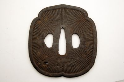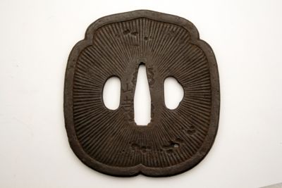 Elsa di spada giapponese con profilo "a forma di pesca", momo gata, con bordo che si ripiega sulla superficie, e con i tre fori canonici, quello centrale (nakagoana) per il codolo, il foro di sinistra (kozuka hitsuana) per il coltellino, e quello di destra (kogai hitsuana) per lo spillone. Incisione leggera della superficie a linee che partono dal centro dell'elsa (yasurime).