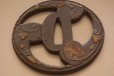 L'intarsio in ottone rappresenta delle foglie, tipico soggetto usato dalle scuole Onin e Heianjo. Il ferro è anche traforato a forma di tre tomoe.