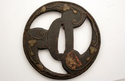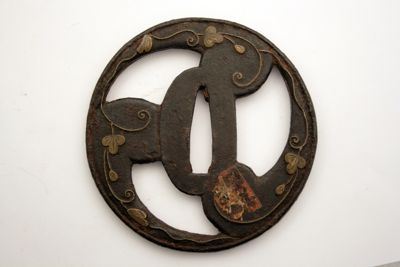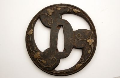 Elsa di spada giapponese di forma tonda e bordo che si ripiega sulla superficie. E' presente solo il foro centrale, nakagoana, per il passaggio del codolo della lama. La forma, realizzata a traforo, è a tre virgole (tomoe). La decorazione, a motivo di tralci fogliati è ralizzata a intarsio d'ottone (shinchu zogan).