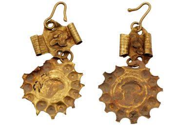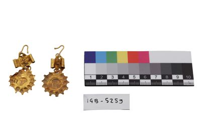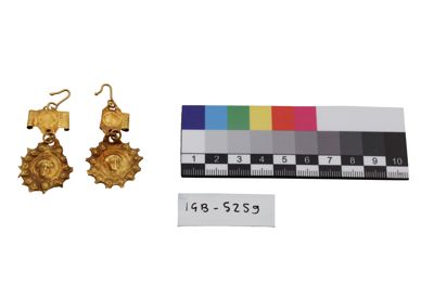 Il manufatto si presenta come un paio di orecchini in oro ad imitazione stile etrusco-romano e iconografie antiche: qui sono raffigurate due teste femminili entro un cerchio i cui lati sono decorati con sfere. Nella parte superiore è invece un cartiglio su ciascun orecchino.