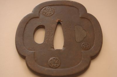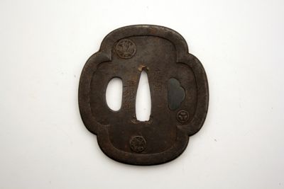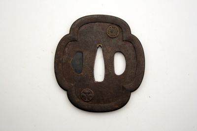 Elsa di spada giapponese di forma quadrilobata (mokko), con bordo ripiegato sulla superficie. Sono presenti i tre fori canonici, quello centrale (nakagoana) per il codolo, il foro di sinistra (kozuka hitsuana) per il coltellino, e quello di destra (kogai hitsuana) per lo spillone, riempito da una piastrina di shakudo. Sono rappresentati degli stemmi familiari (kamon) giapponesi, tra i quali si distingue quello del clan Taira, a farfalla (agehanocho).