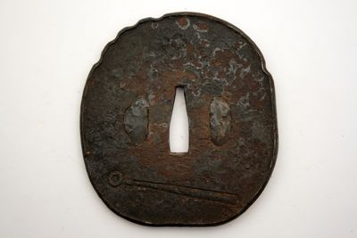 Elsa di spada giapponese di forma irregolare, con bordo ripiegato sulla superficie. la decorazione a bulino e cesello, a leggero rilievo, raffigura il cacciatore di demoni Shoki. I due fori laterali (hitsuana) sono stati coperti da piastrine di piombo.