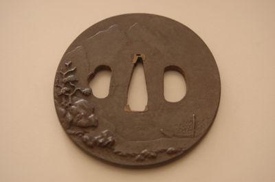 Elsa di spada giapponese di forma tonda, con i tre fori canonici, quello centrale (nakagoana) per il codolo, il foro di sinistra (kozuka hitsuana) per il coltellino, e quello di destra (kogai hitsuana) per lo spillone. E' rappresentato un paesaggio di montagna in stile cinese, con una pagoda ed una casa visibili in lontananza. Il verso rappresanta una barca in prossimità di una riva.