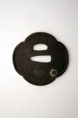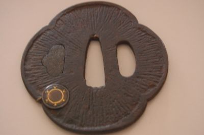 Elsa di spada giapponese di forma quadrilobata (mokko) con bordo ripiegato sulla superficie, con i tre fori canonici, quello centrale (nakagoana) per il codolo, il foro di sinistra (kozuka hitsuana) per il coltellino, e quello di destra (kogai hitsuana) per lo spillone, che è stato chiuso da una piastrina di shakudo. La decorazione è stata realizzata con intarsi in oro e shakudo e la superficie è interessata da raggi che partono dal centro (yasurime). E' raffigurato un tamburello le cui due superfici di pelle sono state slegate dal supporto laccato centrale a form adi doppia coppetta.