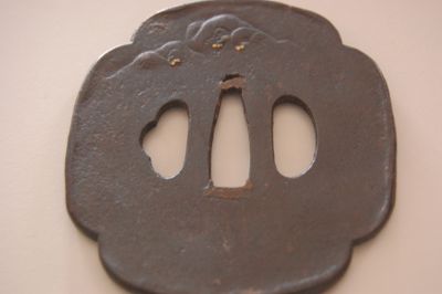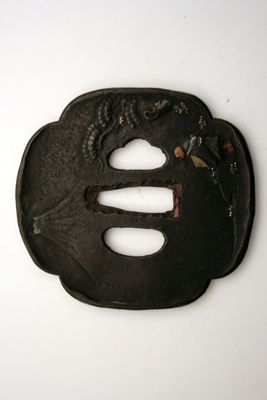 Elsa di spada giapponese di forma quadrilobata (mokko), con bordo rialzato rispetto alla superficie, con i tre fori canonici, quello centrale (nakagoana) per il codolo, il foro di sinistra (kozuka hitsuana) per il coltellino, e quello di destra (kogai hitsuana) per lo spillone. E' rappresentato un uomo con il cappello in mano, che ammira il monte Fuji sotto un albero di pino.