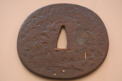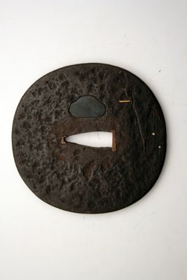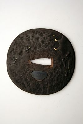 Elsa di spada giapponese di forma ovale, con superficie martellata. L'unico foro laterale presente, il kogaihitsuana, per il coltellino, è stato riempito con una piastrina di shakudo. La decorazione è stata realizzata con intarsi in oro e mostra un paesaggio marino, con due tende sorvolate da anatre.