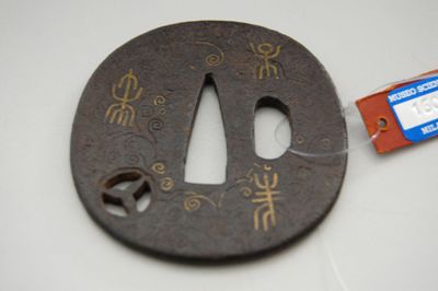Elsa di spada giapponese di forma ovale. Sono presenti il foro centrale per il codolo (nakagoana) e il foro di sinistra (kozuka hitsuana). Sulla superficie sono disegnati ad agemina d'ottone alcuni caratteri cinesi arcaici, mentre in basso si trova uno stemma gentilizio realizzato a traforo.