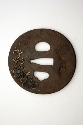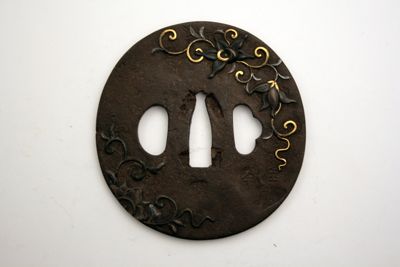 Elsa di spada giapponese di forma ovale, con i tre fori canonici, quello centrale (nakagoana) per il codolo, il foro di sinistra (kozuka hitsuana) per il coltellino, e quello di destra (kogai hitsuana) per lo spillone. La decorazione a motivo di foglie e fiori in rilievo, e ideogrammi impressi, è stata realizzata con intarsi in oro e shakudo.