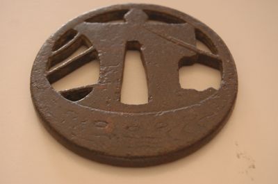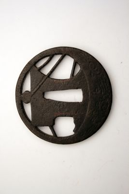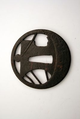 Elsa di spada giapponese di forma rotonda, con motivo traforato di barca fra le onde. I fori laterali, hitsuana, sono dissimulati all'interno del disegno.