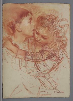 Disegno a sanguigna di medie dimensioni di Pietro Gaudenzi, raffigurante un bambino e una bambina a mezzobusto che si abbraccciano, rifinito solo nei volti e appena abbozzato per il resto.