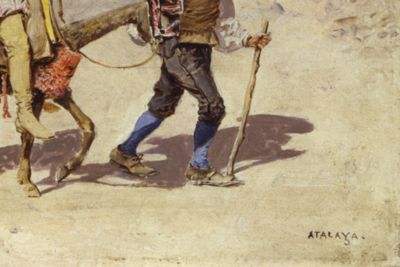 Dipinto a olio di piccole dimensioni di Enrique Atalaya, raffigurante Don Chisciotte su un asino, condotto a mano da Sancho Panza, seguiti da un cavallo che porta i pezzi di un'armatura.