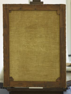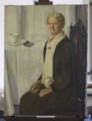 Dipinto a olio di medie dimensioni di Pietro Gaudenzi, raffigurante Luisa Scandroglio Rossi, madre di Guido Rossi, seduta su una sedie d'epoca, in un interno domestico, davanti aun tavolo coperto da una tovaglia bianca. Seduta di profilo verso sinistra, volge la testa verso il riguardante, indossa un abito nero e tiene nella mano destra un paio di occhiali.