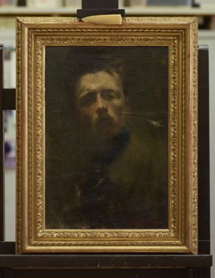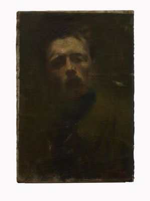 Dipinto a olio di piccole dimensioni di Pietro Gaudenzi, raffigurante un autoritratto del pittore a mezzo busto, con il viso rivolto frontalmente verso il riguardante, su fondo scuro.
