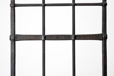 Leggio in ferro battuto con quattro reggicandela, recante una scritta tratta dal Cantico delle Creature di San Francesco