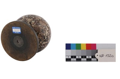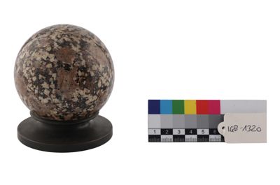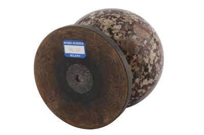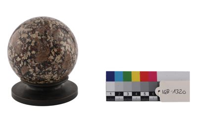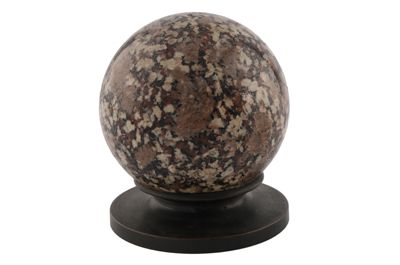 Il manufatto si presenta come un fermacarta sferico in granito ghiadone con base in ottone di piccole dimensioni.