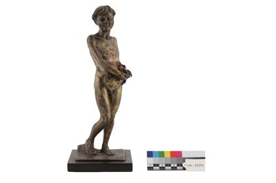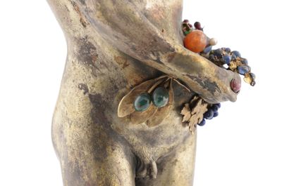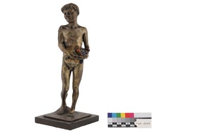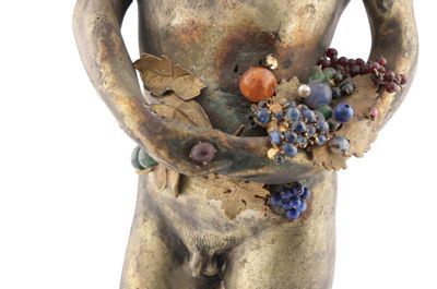 Statuetta in metallo, su base in legno, rappresentante un ragazzo con in mano un canestro di frutta, la quale è fatta di gemme. È visibile una iscrizione alla base della statuetta: