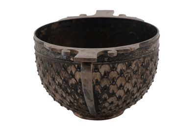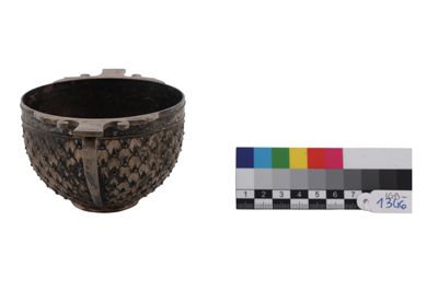 Il manufatto si presenta come una coppa in argento di piccole dimensioni su base di legno: qui è una decorazione sulla parte esterna a piume di pavone.