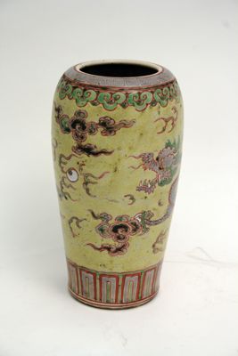Vaso in porcellana di forma pressoché tubolare, leggermente rastremato al piede e con alta spalla terminante nella bocca, di diametro largo con bordo rientrante, che reggeva probabilmente un coperchio. Il corpo è completamente ricoperto dall'invetriatura che si presenta gialla, traslucida e finemente incrinata. La base è ornata a smalti sopra coperta con una banda a meandri in viola, rosso e verde. Il bordo presenta una fascia viola ornata a motivo di greche leiwen e sotto di questa una teoria di nuvole a fungo lingzhi in verde. Al centro, sul fondo giallo, si staglia un drago a tre artigli, fra nuvole viola e nere, che insegue la perla sacra buddista, in bianco.